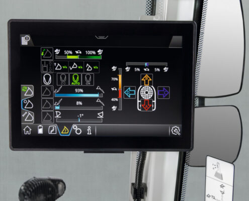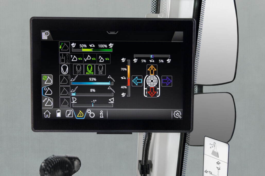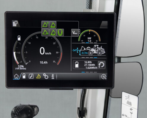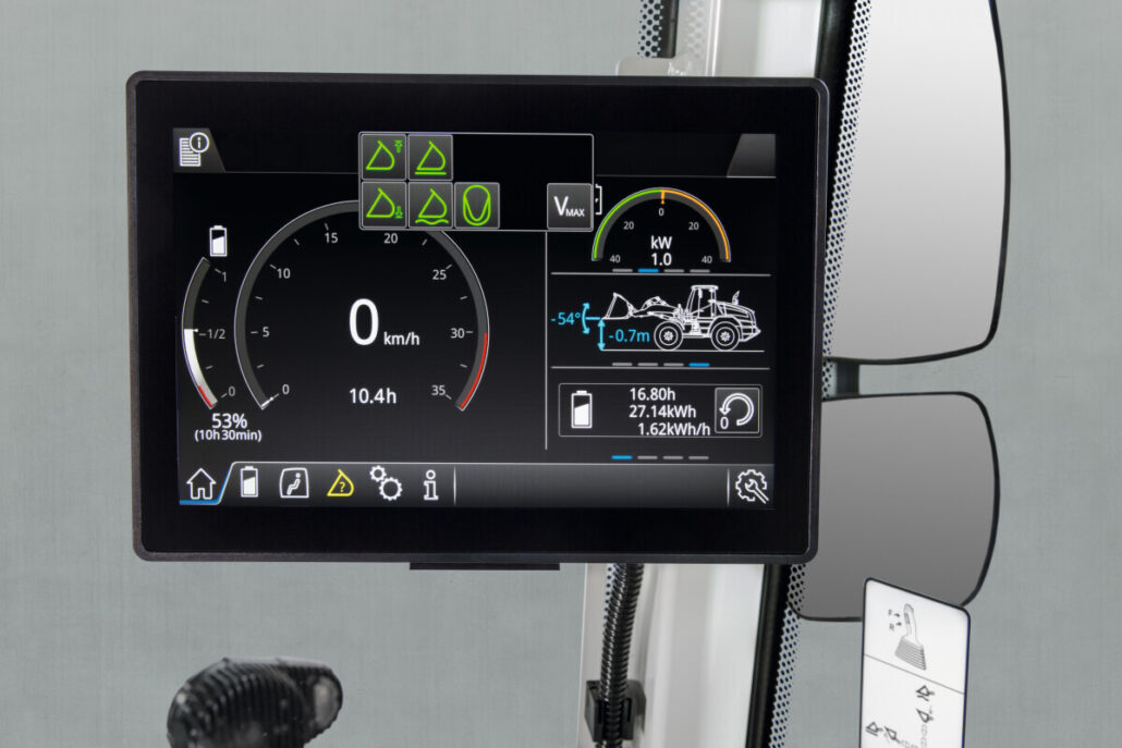 Kabina je dizajnirana s naglaskom na ergonomiju i preglednost. Velike staklene površine pružaju izvrstan pogled na radni prostor, dok moderni dodirni terminal omogućuje vozaču da u svakom trenutku ima pregled nad stanjem stroja, razinom napunjenosti baterije, procijenjenim vremenom rada i ostalim važnim parametrima. Tijekom punjenja sustav prikazuje napredak punjenja i predviđeno vrijeme završetka, što dodatno olakšava organizaciju rada.