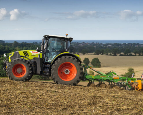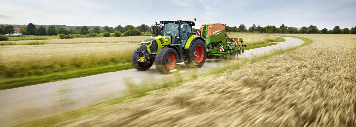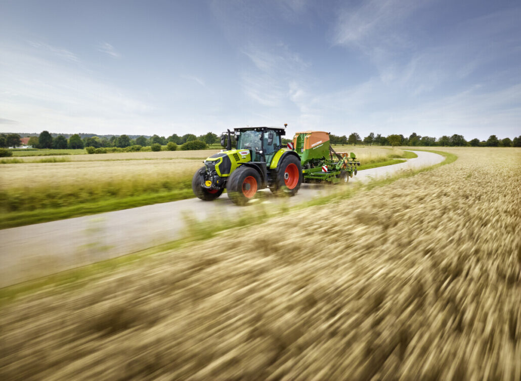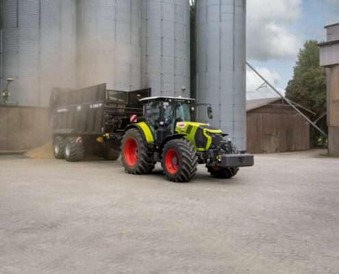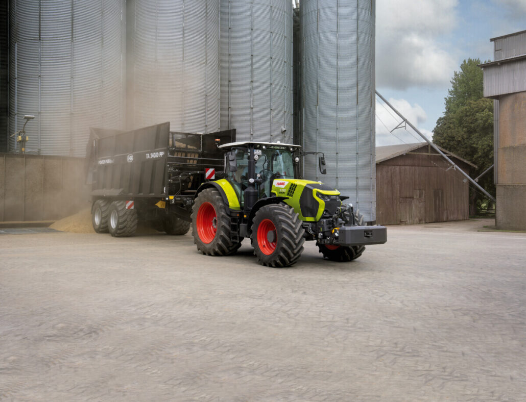 Cmatic kontinuirani mjenjač, razvijen u Claas Industrietechniku, pruža visoko učinkovito upravljanje pogonskim sklopom, s funkcijama poput automatske kočnice prikolice i posebnog načina rada za prednji utovarivač. Dugi međuosovinski razmak i uravnotežena raspodjela težine jamče besprijekoran prijenos snage na tlo, čak i kod teških priključaka.